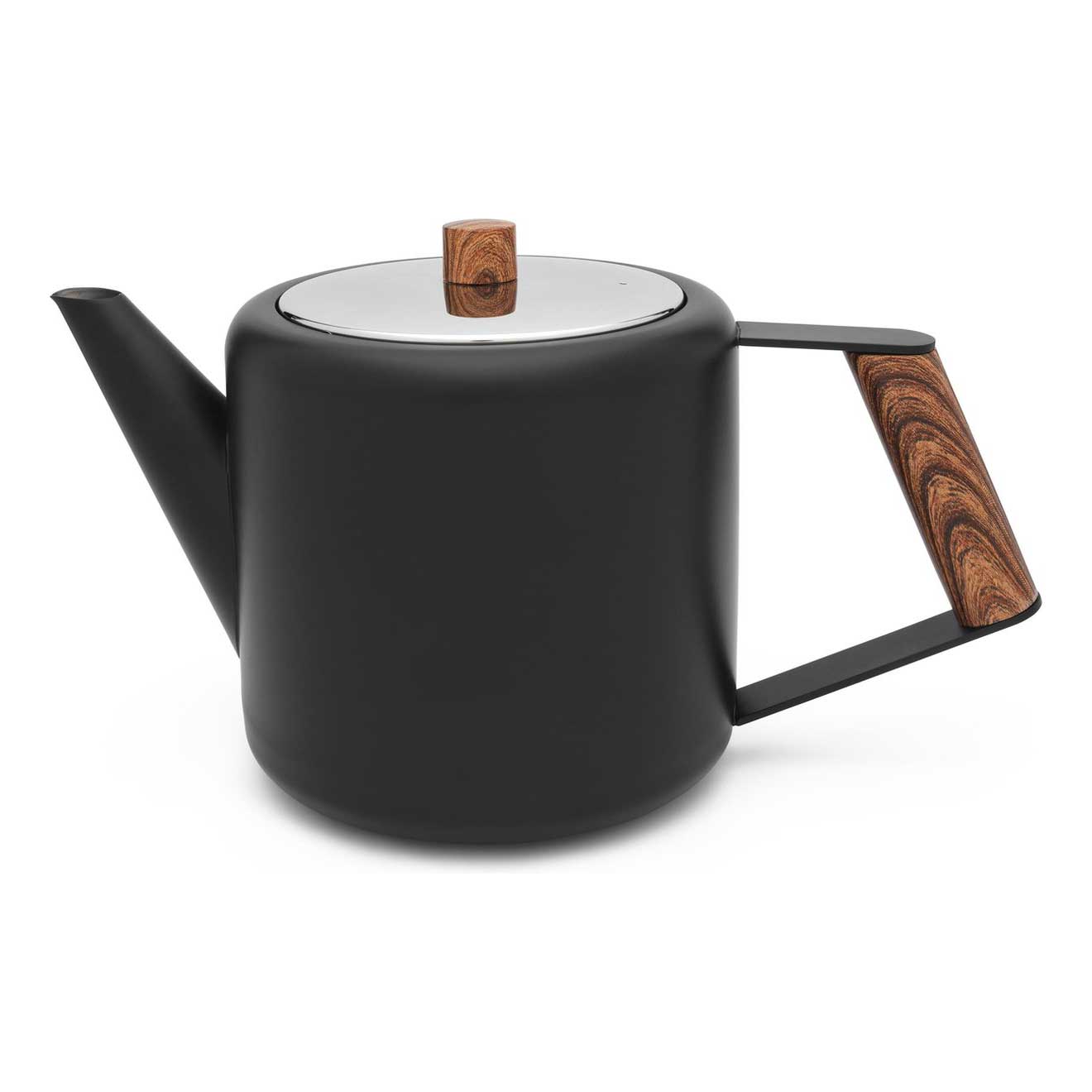 Die Boston Teekanne hat ein modernes Aussehen. Das neutrale mattschwarze Gehäuse ist robust und zeitlos – die Farbe des Griffs und des Knopfs auf dem Deckel ist warm und natürlich. Dank der Doppelwand hält diese Teekanne den Tee lange warm. Der wohlgeformte Ausgießer sorgt dafür, dass die Teekanne nicht tropft oder ausläuft.