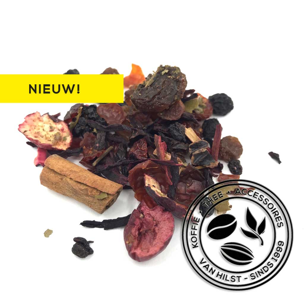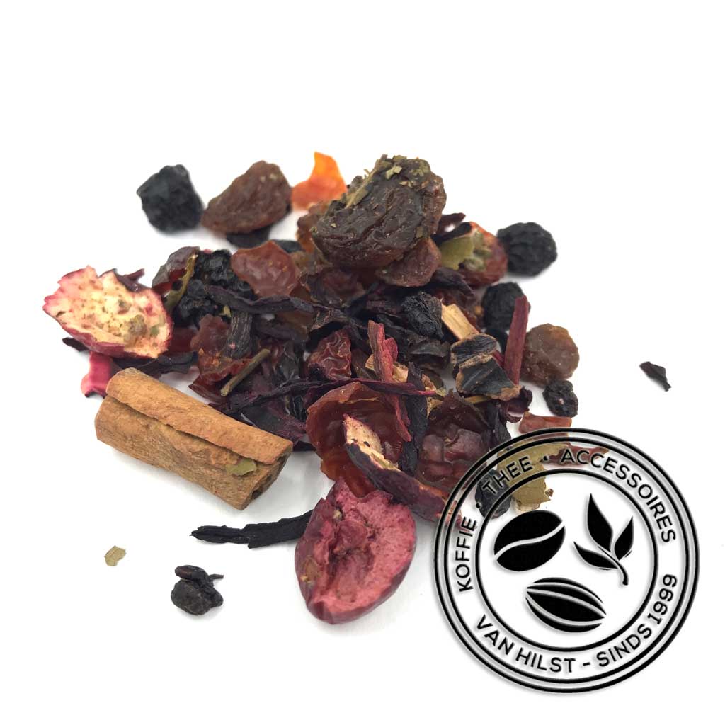 Hibiscus, aronia bessen, rozenbottelschillen, druiven, johannesbrood stukjes, kaneel, zoete bramenbladeren, natuurlijk aroma, vlierbessen, bramen, cranberry schijfjes, frambozen.